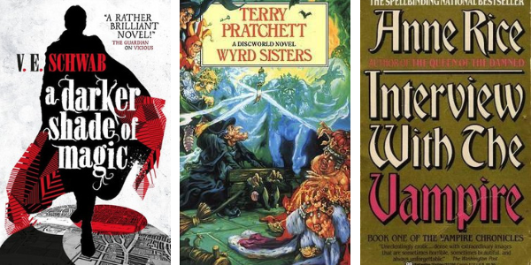 A Darker Shade of Magic by V.E. Schwab, Wyrd Sisters by Terry Pratchett, and Interview with the Vampire by Anne Rice.